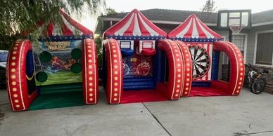 Designed for parties and events. It combines three different games side-by-side under red-and-white circus-style canopies: Soccer Goal Challenge (left side): Players kick balls through target holes to score. Basketball Shootout (center): Dual hoops allow for head-to-head basketball shooting contests. Velcro Dartboard (right side): Oversized dartboard where players throw velcro balls or darts to score points.