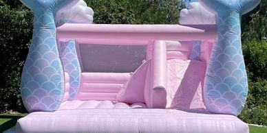 Make a splash at your next party with our enchanting Mermaid Bounce House! Featuring pastel pink walls, shimmering mermaid tails, and plenty of space for jumping and sliding, this inflatable is perfect for birthdays, backyard celebrations, and magical under-the-sea adventures. Safe, clean, and full of fun—kids will love it, and parents will too!