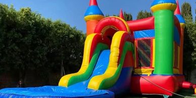 Double the fun with our Castle Combo Bounce House! This inflatable has a spacious jumping area, a climbing wall, and a colorful slide that ends in a splash pool (can be used wet or dry). Its bright primary colors and castle turrets make it perfect for any celebration.